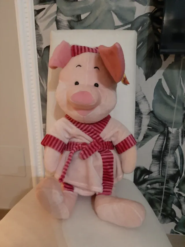 Morbido peluche di Pimpi, il maialino Disney. Indossa un simpatico accappatoio rosa. -Altezza 60 cm. - Personaggio: Pimpi - Licenza: Disney - Colore: Rosa