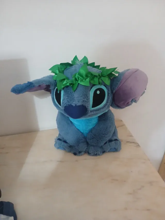 Peluche del personaje Stitch, de Disney, con una corona de hojas verdes. - Color azul. - Orejas grandes. - Corona de hojas verdes.