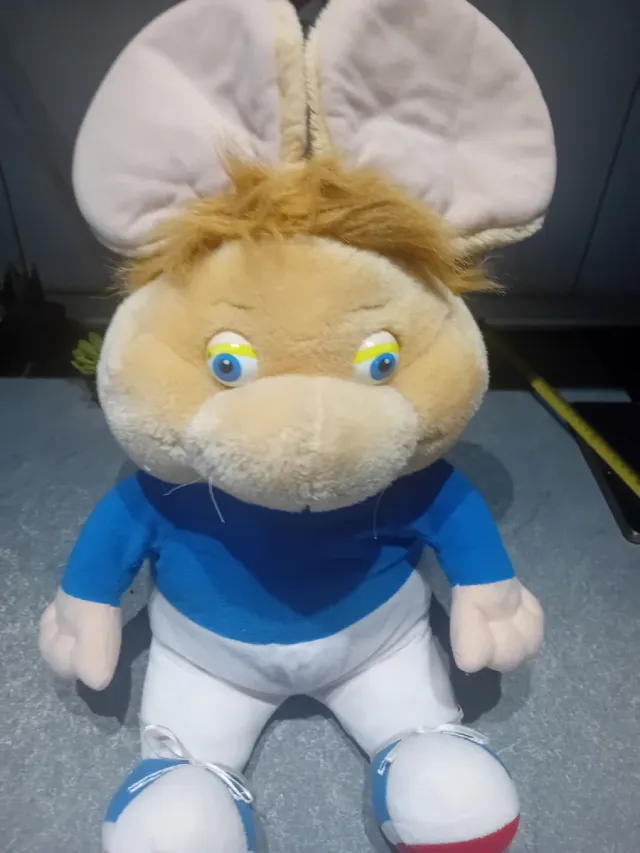 Dettagli del prodottoPeluche di un simpatico topo con grandi orecchie e capelli castani. Indossa una maglietta blu e pantaloni bianchi.