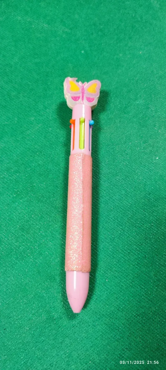 Penna a 6 colori con un simpatico decoro a forma di farfalla. - Meccanismo a scatto per selezionare i colori. - Corpo della penna glitterato.