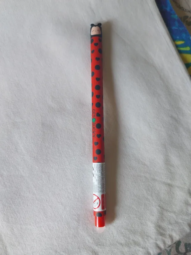 Penna cancellabile con simpatico design a coccinella. - Corpo rosso con pois neri e cuoricini. - Cappuccio con faccina. - Inchiostro cancellabile rosso, punta da 0.7 mm