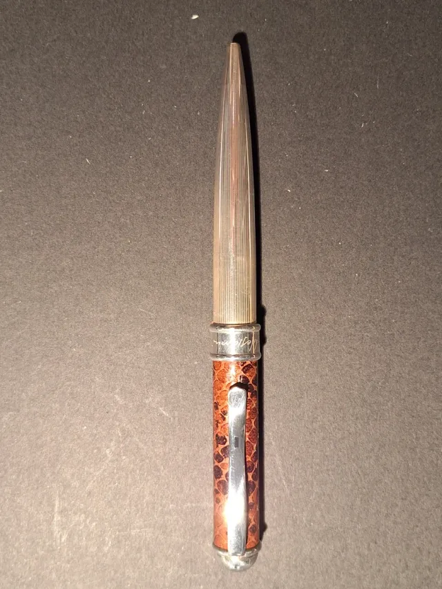Elegante penna a sfera con finiture in argento. Marca Baldessanini - Corpo con texture effetto pelle di serpente. - Clip in metallo argentato. - Dettagli in argento 925