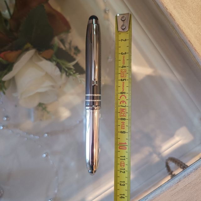 Dettagli del prodottoPenna colore argento, da una parte c'è una scritta che non mostro per non fare pubblicità, per le sue dimensioni ridotte è molto comoda da tenere in borsa, sul tappo c'è la gommina per il touch screen e sulla parte opposta una luce a led che si accende facendo una leggera pressione, sulla superficie presente delle leggerissime righe ma ciò non compromette la bellezza dell'articolo.