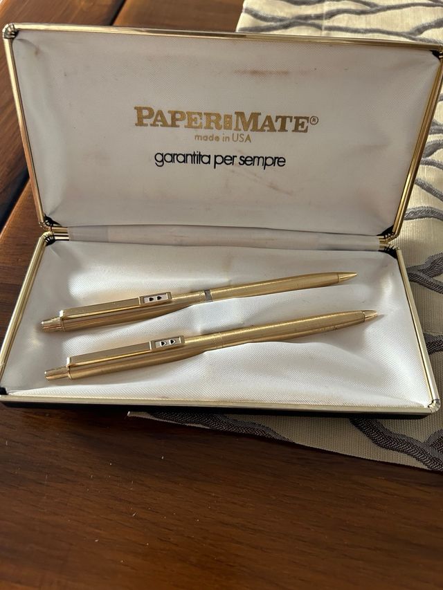 Set articoli da scrivania “Paper Mate” Una penna a sfera+matita da disegno. Scatola originale. Placcate oro. Articoli praticamente mai usati.