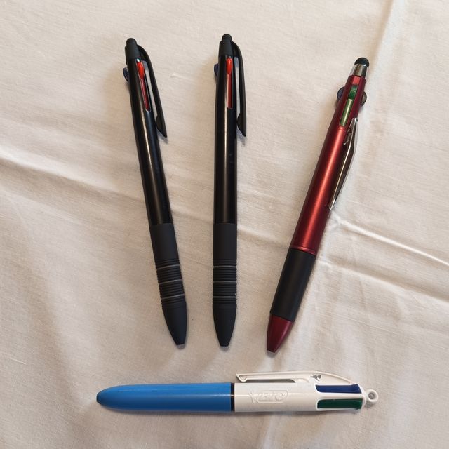 Penne 4 colori nero, blu, rosso e verde una è della Bic le altre tre presentano una scritta pubblicitaria.