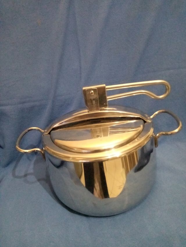 Dettagli del prodottopentola a pressione della termofond in acciaio inox made in Italy, usata ma in ottime condizioni con qualche segno di normale usura all interno ma che non ne pregiudica il normale funzionamento, ideale per cucinare tutto quello che ha bisogno di lunghe cotture che con la pentola si dimezzano i tempi. guarnizione belle.