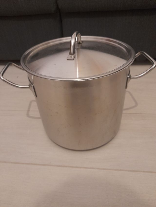 23 cm altezza x 25,5 diametro unipezzo. Acciaio 18/10 fondo mezzo centimetro. Manici, coperchio compreso, in acciaio inox peso 2,5 kg