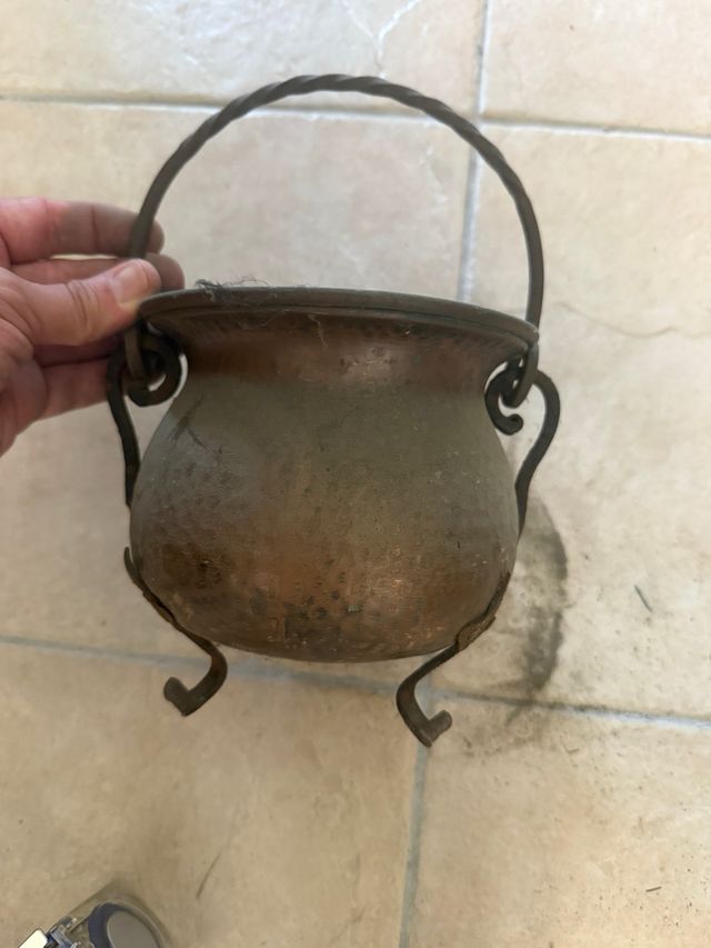 - Piccola pentola in rame con manico in ferro battuto.