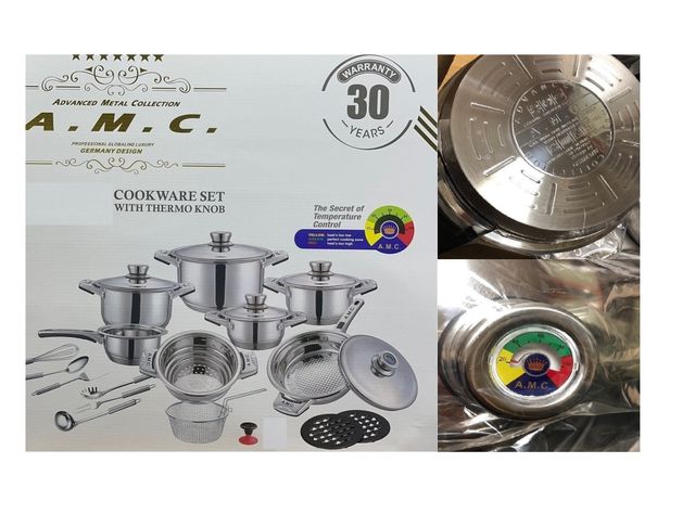 Dettagli del prodottoBATTERIA AMC 23 PEZZI ADATTA PER INDUZIONE – GAS – FORNO - ELETTRICO e VETROCERAMICA dotata di controllo della temperatura integrato per cucinare con precisione - 1 casseruola 24×14 cm 6.3lt 1 casseruola 20×10 cm 3.1lt 1 casseruola 18×9 cm 2,3lt 1 casseruola 16×8 cm 1,6lt 1 casseruola 16×8 cm con manico lungo 1,8lt 1 padella bistecchiera 24×6.5 cm 2.9lt 1 Scolapasta 20×9,5 cm 2 coperchi 24 cm 1 coperchio 20 cm 1 coperchio 18 cm 1 coperchio 16 cm 1 Pomello di Ricambio 6 mestoli