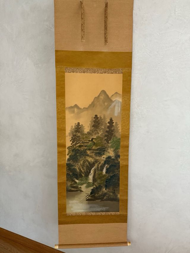 Pergamena giapponese dipinta a mano con paesaggio montano e cascata. - Tecnica di pittura tradizionale. - Cornice decorativa. - Montaggio su rotolo.