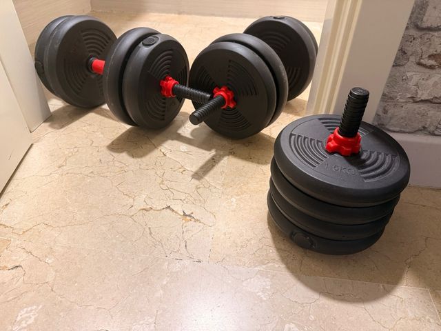 Dettagli del prodottoSet di manubri regolabili con un peso totale di 30kg. Include tutti gli accessori necessari per l'uso e la configurazione. - Dischi di peso. - Barre. - Chiusure di sicurezza. La descrizione è stata tradotta automaticamente.