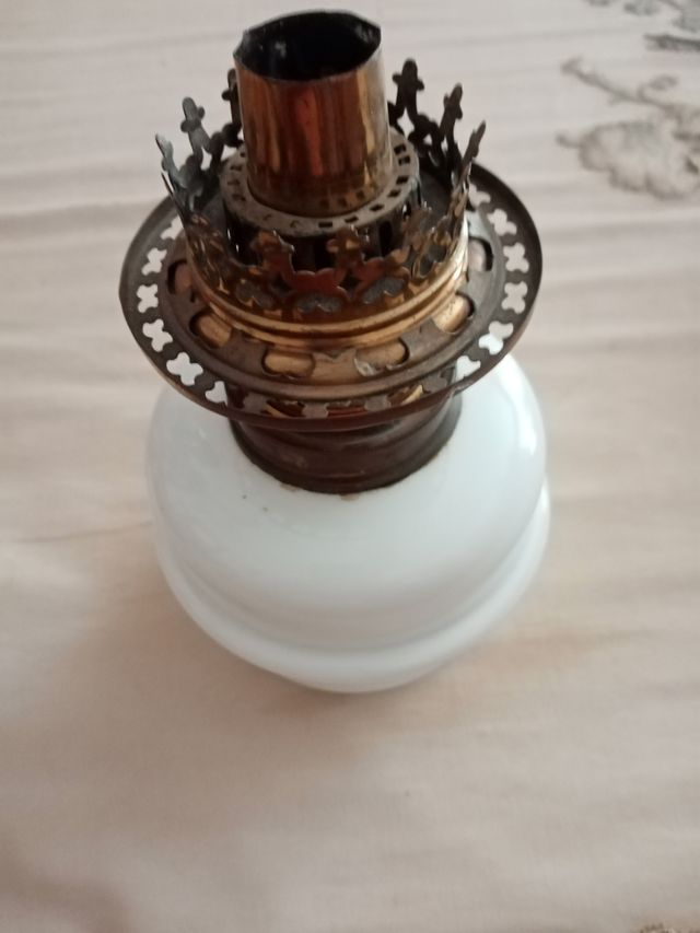 Dettagli del prodottoPetroliera bianca in opalina, per lume antico, imbocco misura 10, 5,che va all'interno della base del lume. Misure del prodotto