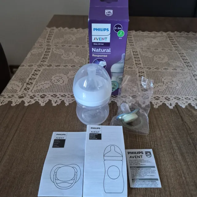 Set regalo Philips Avent con biberon a flusso lento e ciuccio. - Biberon Natural Response da 0-3 mesi. - Ciuccio incluso sigillato