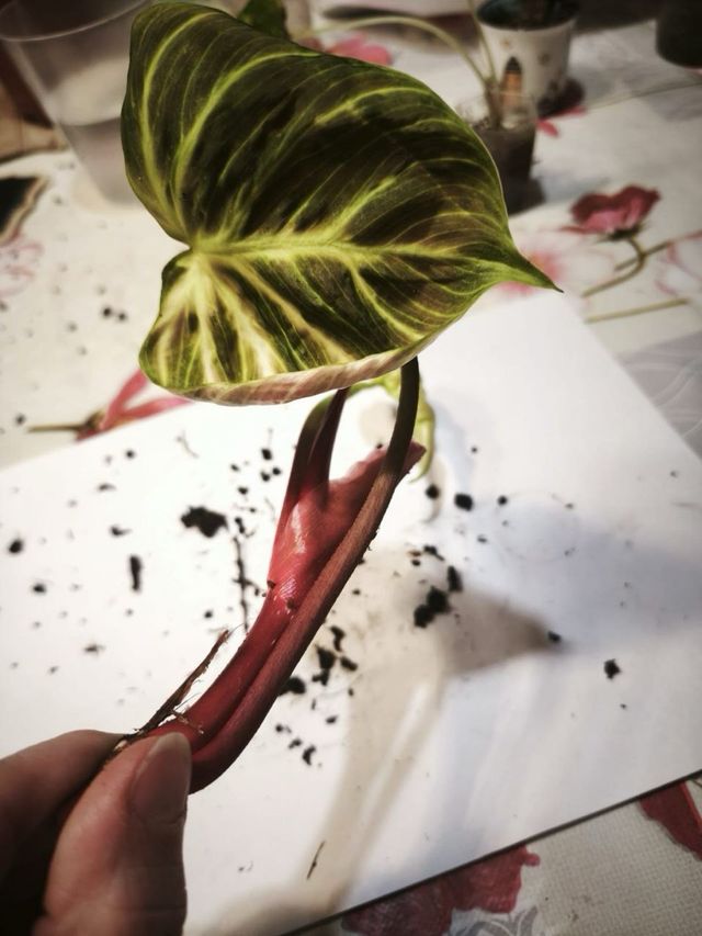 Dettagli del prodottoPianta di Philodendron El Choco Red, con foglie vellutate e venature evidenti.