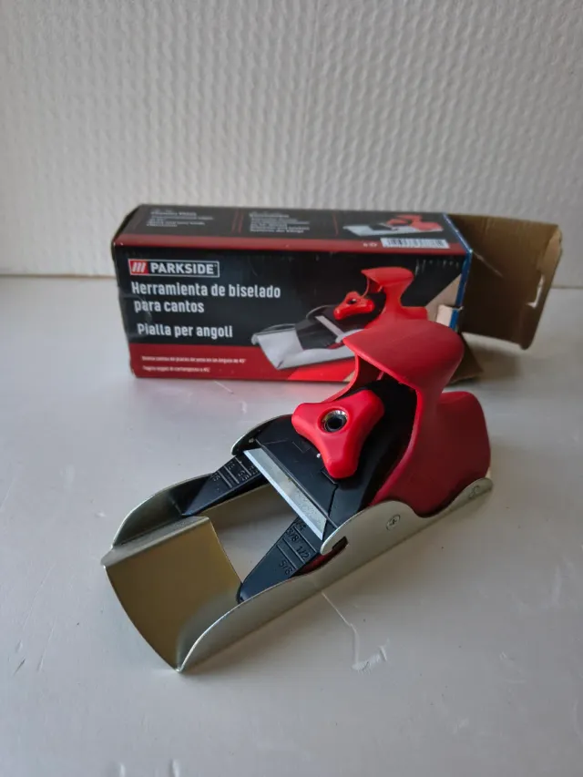 Pialla per smussare bordi e angoli, marca Parkside. - Struttura in metallo e plastica rossa. - Lama affilata per tagli precisi. - Regolazioni per diverse angolazioni.