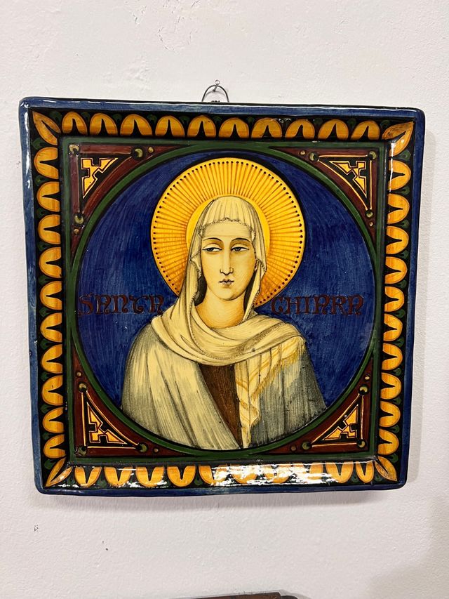 Dettagli del prodottoPiastra dipinta a mano, in ceramica Deruta, raffigurante Santa Chiara anni 60. Misure del prodotto