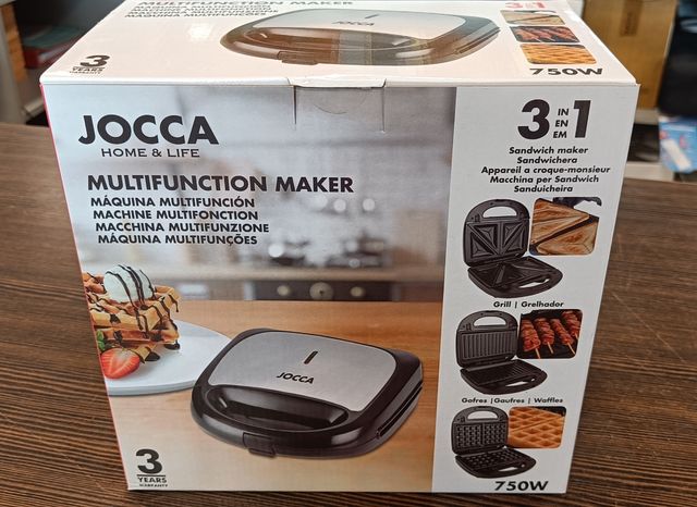 Dettagli del prodottoJocca Waffle Maker 3 in 1 - 3 piastre antiaderenti intercambiabili per panini, waffle e grill.