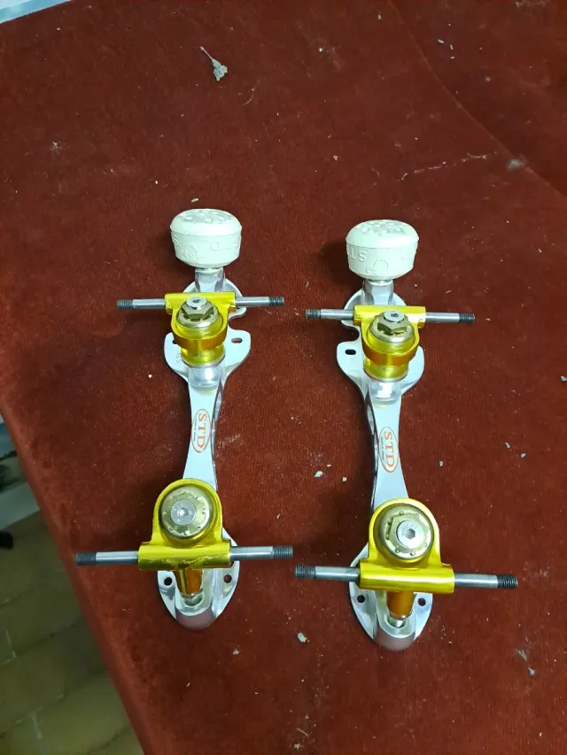Piastre per pattini a rotelle marca STD, modello Curve. - Misura 160. - Colore argento e oro. Nuove, solo montate e smontate da un pattino