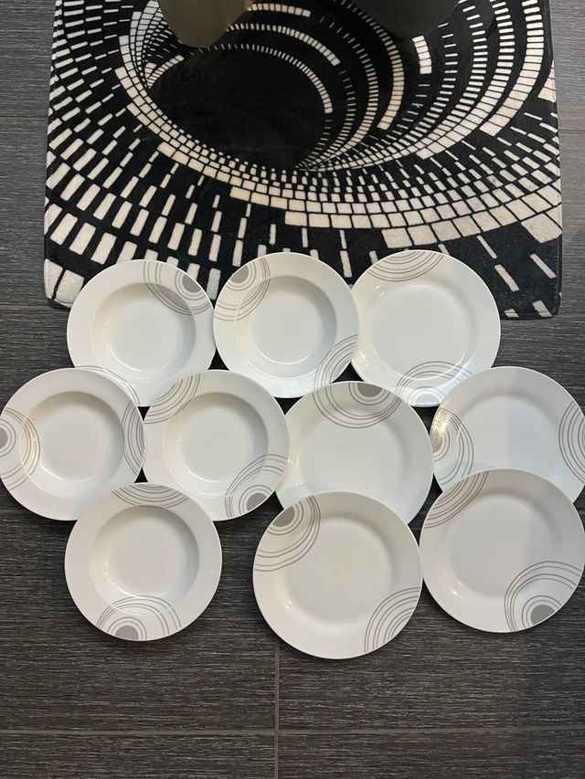 Set di porcellana composto da 5 fondi + 5 piatti + zuppiera, buone condizioni, piatti intatti eccetto 1