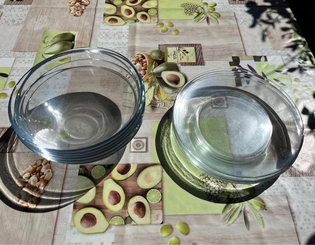 In vetro, tenuti con cura e poco utilizzati. Sei piatti fondi e sei piatti piani. Se interessano più articoli contattatemi, faccio unica spedizione e sconti.