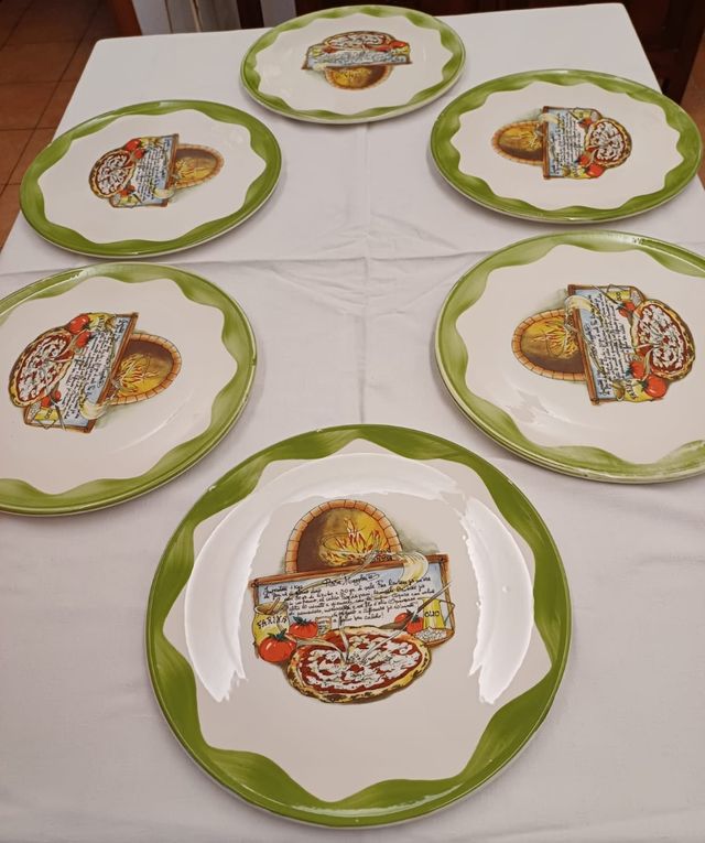 Dettagli del prodottoN.6 piatti da pizza.diametro 34 cm. La colorazione del bordo verde non ha la stessa intensità su tutti i piatti che sembra quasi una lavorazione artigianale. 2 piatti presentano una piccola smiccatura nel bordo ( vedi foto) .