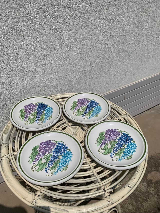 Dettagli del prodotto🪻Set di 4 piatti piani firmati Richard Ginori con glicine e bordo verde. In ottime condizioni (tranne uno che ha dei segni, mostrati nell’ultima foto).