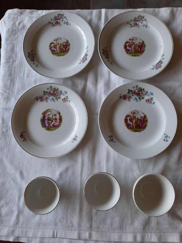 Dettagli del prodotton. 4 piattini da frutta/dolce diametro 19 cm ca. con decori floreali e scene campestri. N. 2 ciotoline diametro 7 cm ca- Altezza 6 cm ca. con decori floreali. il prezzo è x tutti I pezzi. Alcune imperfezioni e macchie dovute al tempo. Da collezione