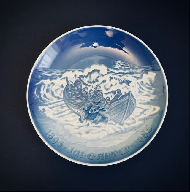 Il motivo del piatto del 1985, che raffigura una scialuppa di salvataggio in mare, è lo stesso del piatto di Natale di Bing & Grøndahl del 1932.