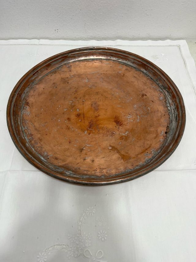 Dettagli del prodottoVendo piatto/vassoio d'antiquariato in rame, in ottime condizioni, al prezzo di 25 euro. Peso 1,2 kg, diametro 43 cm, altezza 3 cm.