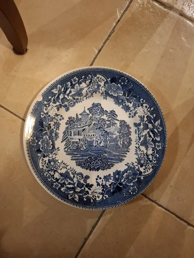 Elegante piatto in ceramica con decorazione blu e bianca, risalente al 1835. - Design floreale e paesaggistico. - Stile inglese tradizionale.