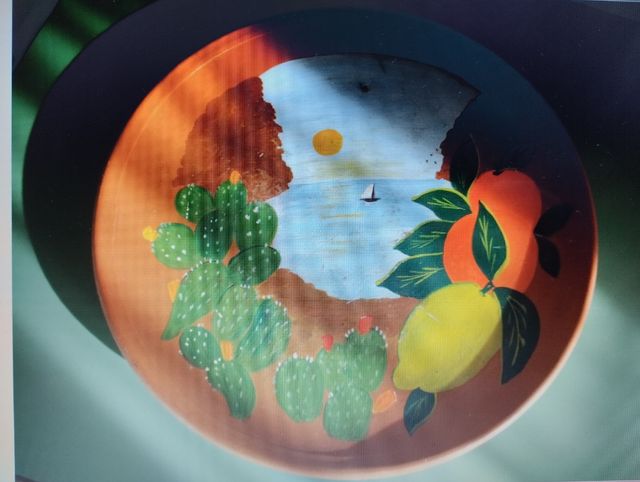 Dettagli del prodottoPiatto d' argilla lavorato e dipinto a mano cm 30.