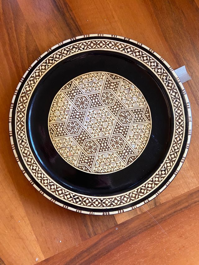 Piatto decorativo da appendere, intarsiato in madreperla. Ancora con cartellino appeso. Diametro: 26cm