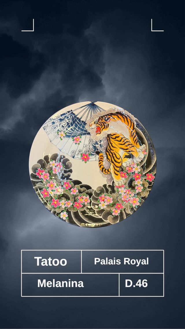 Dettagli del prodottoPiatto decorativo rotondo con un diametro di 46 cm, raffigurante una tigre e fiori.