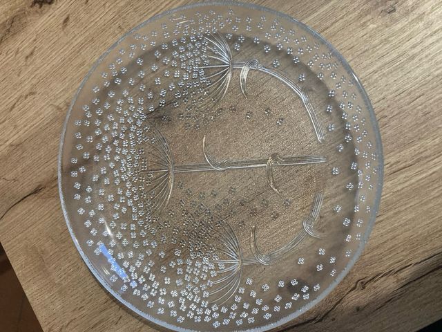 Dettagli del prodottoPiatto rotondo in vetro trasparente con decorazioni.