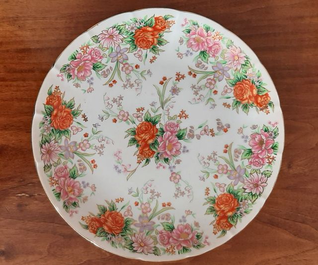 Dettagli del prodottoElegante piatto in porcellana stile giapponese Kutani (con punzonatura sul retro come da foto), con raffinata decorazione floreale policroma nei toni del rosa, arancione e verde e bordo leggermente ondulato con profilo dorato.