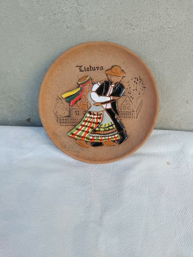 Dettagli del prodottoPiatto in ceramica decorativo, un ricordo vintage dalla Lituania. Raffigura una coppia in abiti tradizionali che balla, con case e alberi sullo sfondo.