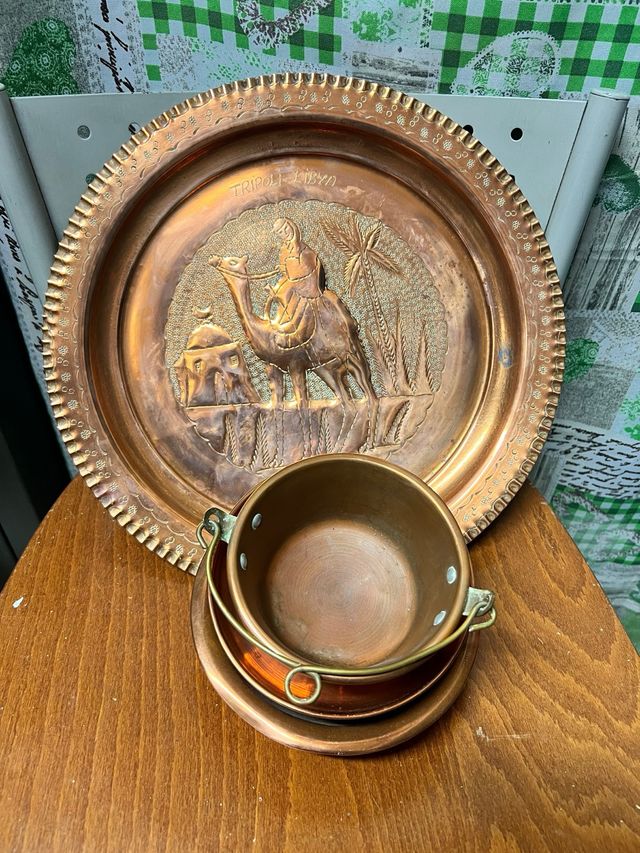 Dettagli del prodottoSet composto da un piatto decorativo e una piccola ciotola, entrambi in rame.