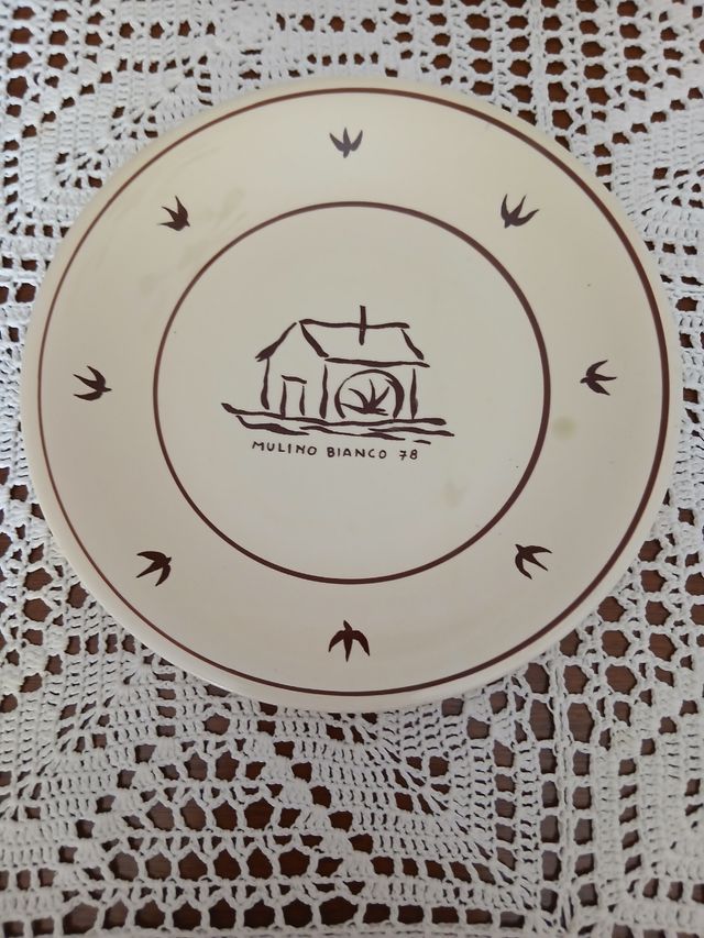 Piatto da collezione Mulino Bianco del 1978. - Raffigurante un mulino con uccellini. - Decorazione in stile rustico.