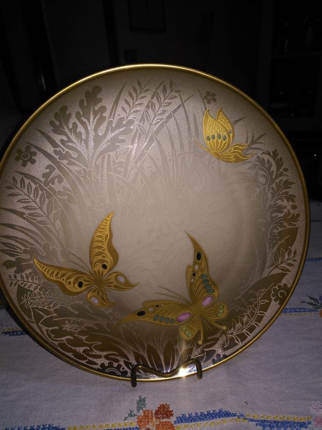 Salve, come da titolo vendoPiatto ornamentale in ceramica dioreficeria su porcellana incisa a l'acquaforte, oro 24 kt. arte morbelli serie Myrica. 30 cm diametro.