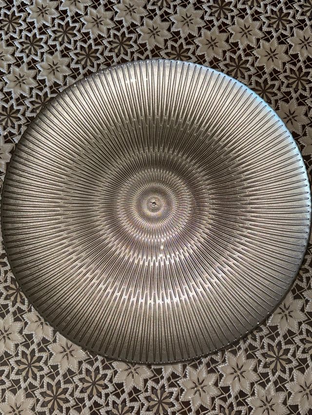 Elegante piatto portafrutta con un design a raggiera. - Motivo decorativo centrale. - Bordi scanalati. - Finitura metallica.