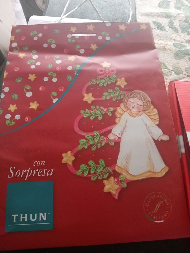Piatto decorativo Thun, parte della collezione Con Sorpresa. - Design natalizio con angelo e albero. - Logo Capolavoro Italiano presente.