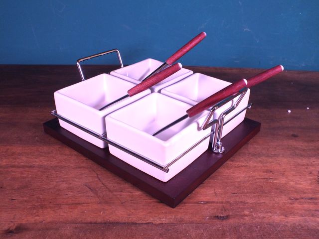 Dettagli del prodottoVassoio con 4 scodellini per poter servire ai vostri amici l'aperitivo o antipasti. Possiede anche i rispettivi mestolini da mettere dentro le scodelline Misure del prodotto