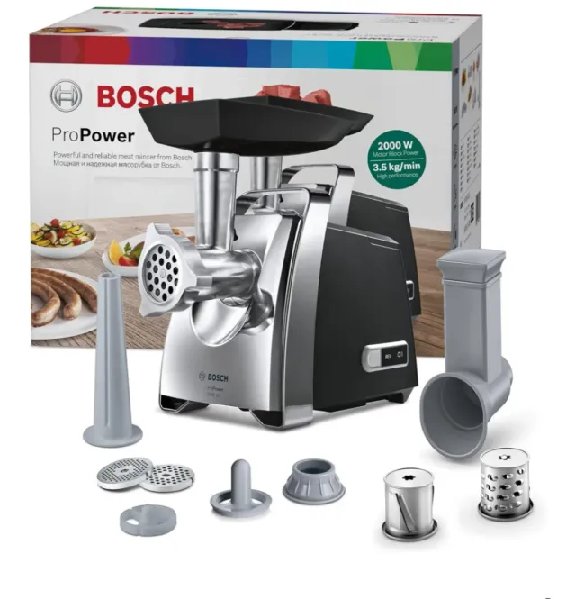Dettagli del prodottoTritacarne Bosch ProPower in ottime condizioni, usato solo due volte. Nella sua scatola originale. Potenza di 2000 W. Prestazioni di 3,5 kg/min. Design moderno e robusto. La descrizione è stata tradotta automaticamente.