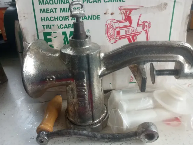 Dettagli del prodottoTritacarne manuale della marca Elma, ideale per preparare i propri insaccati e tritare carne in casa. Realizzato in metallo resistente. Include manovella in legno, base con vite per fissaggio al tavolo, modello numero 8. La descrizione è stata tradotta automaticamente.