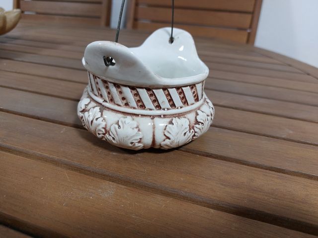 Carinissimo piccolo cestino portaoggetti in ceramica con manico in metallo, anche decorativo.