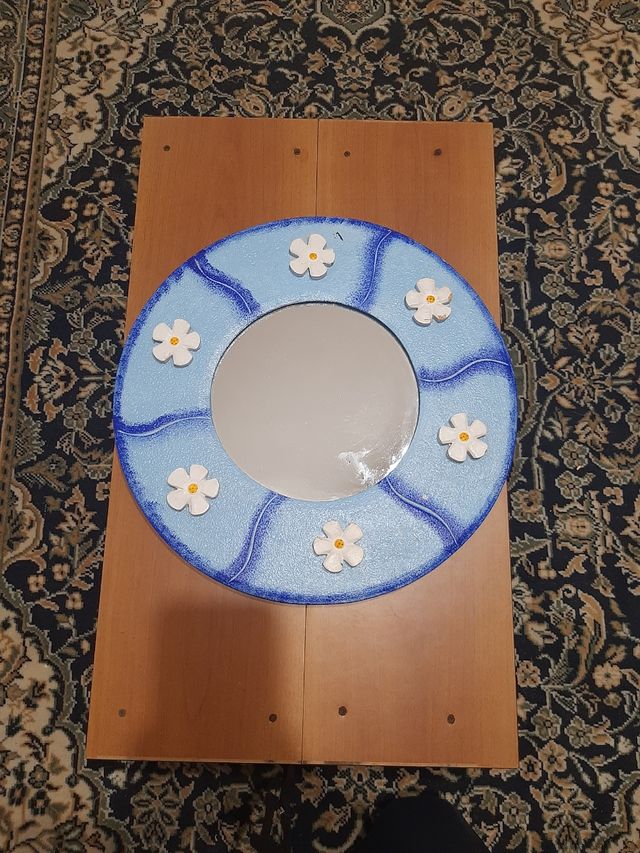 Dettagli del prodottosui toni del celeste w blu decorato con fiori bianchi. specchio da parete non di grandi dimensioni