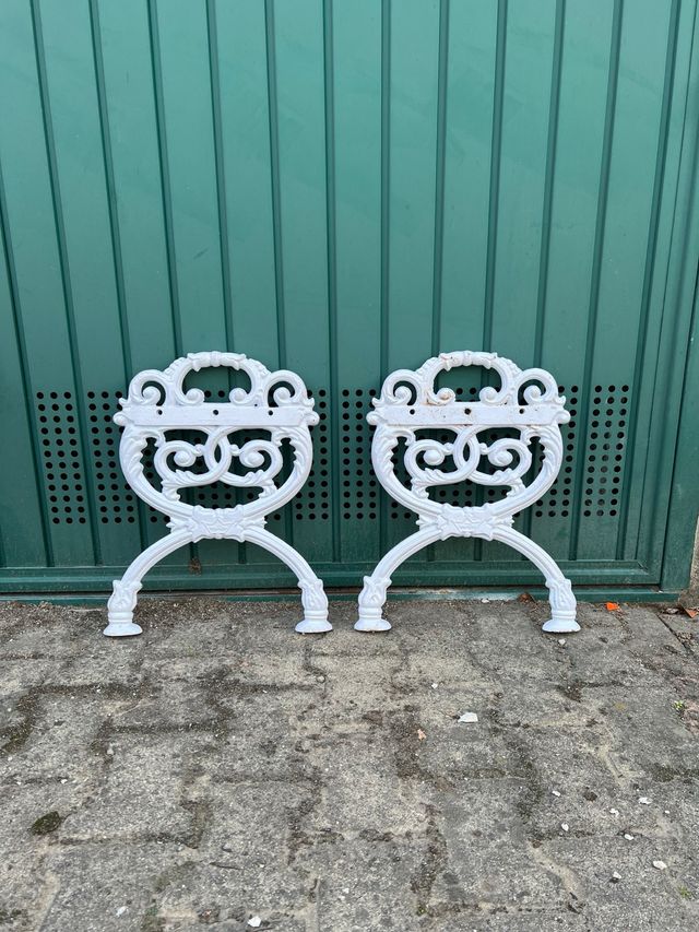 Dettagli del prodottoCoppia di piedini in ghisa verniciati di bianco, ideali per panchine e panche, mai usati, come completi di ferramenta.