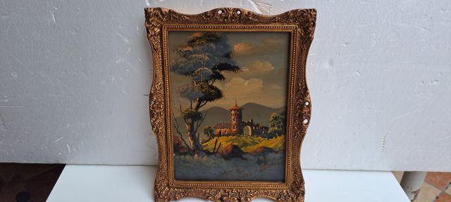 Dettagli del prodottoPietro Angelini Dipinto a olio incorniciato che raffigura un paesaggio collinare con un castello e una torre - cornice in stile barocco