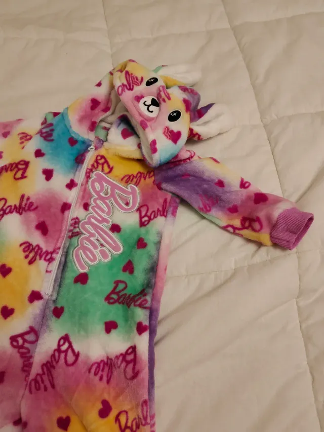Dettagli del prodottoMorbido pigiama tuta intera in pile con fantasia tie-dye e cuoricini.