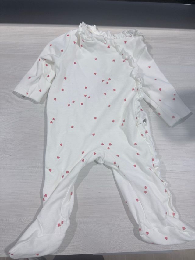 Dolce pigiamino per neonata con un simpatico motivo di cuoricini rossi. - Colore bianco. - Maniche lunghe. - Collo e bordo con volant. - Piedini inclusi. Altezza 56cm